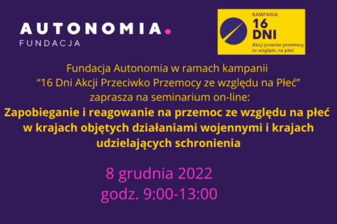 English below Український незабаром Zaproszenie w Polskim Języku Migowym <<kliknij W ramach 31. kampanii “16 Dni Akcji Przeciwko Przemocy ze … Czytaj dalej „Seminarium on-line: Zapobieganie i reagowanie na przemoc ze względu na płeć w krajach objętych działaniami wojennymi i krajach udzielających schronienia”